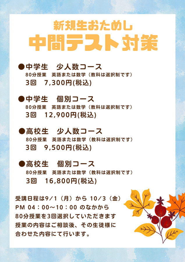 部活動や習い事がお忙しい生徒さんでも空いている時間で効率よく学習して頂けるよう授業時間は選択制となっており後から変更もできます。ご連絡さえ頂ければ当日欠席の振替も可能となっております。